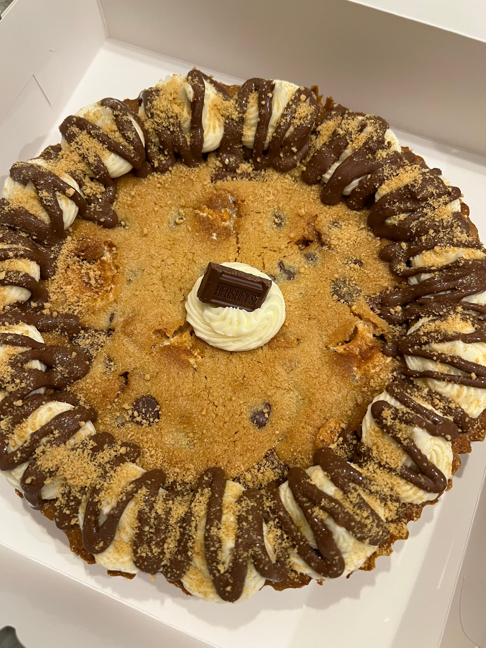 All the s’mores flavor—none of the dirt, smoke, or questionable guitar playing. This chewy chocolate chip cookie features graham crackers, Hershey bar chunks, and toasted marshmallows, then baked to golden perfection and finished off with Vanilla Buttercream, chocolate drizzle, and graham cracker crumbs.